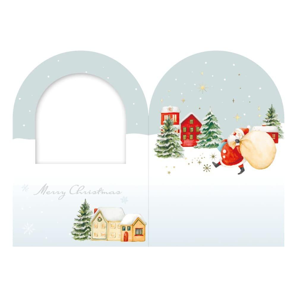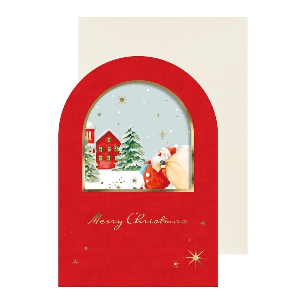 窓のような形のカードに、雪景色とプレゼントを運ぶサンタクロースが描かれています。
