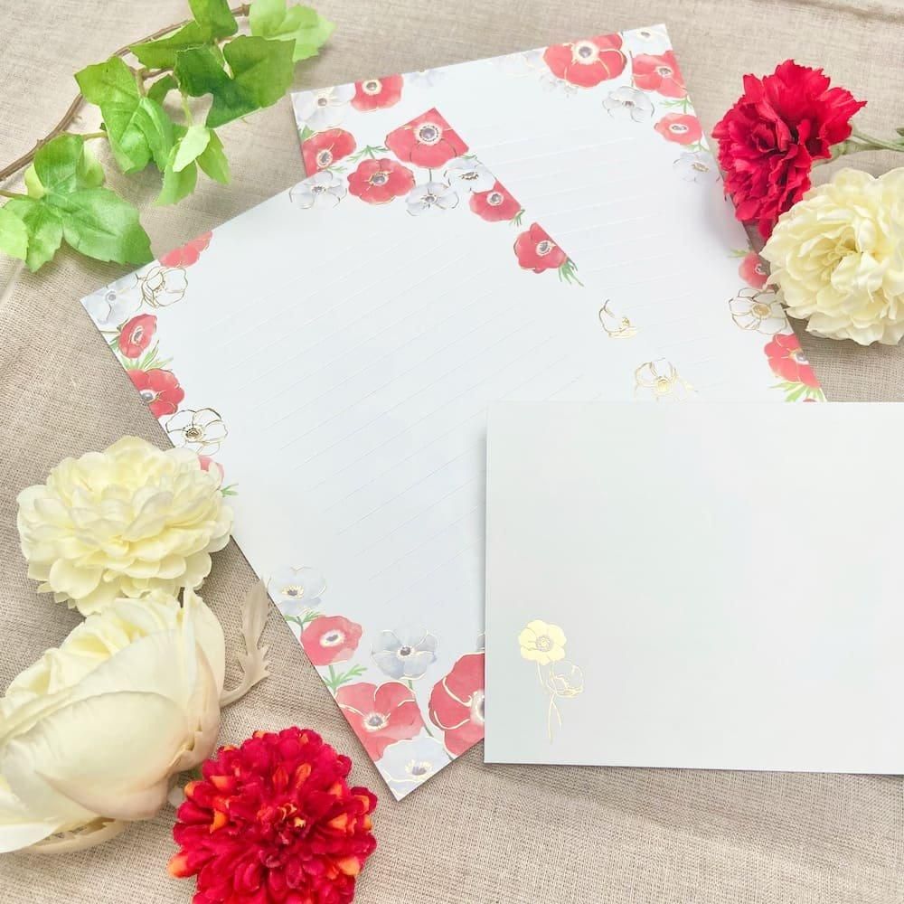 赤・白のアネモネが華やかに咲き誇るデザインは、気持ちを伝えるお手紙に彩りを添えてくれます。