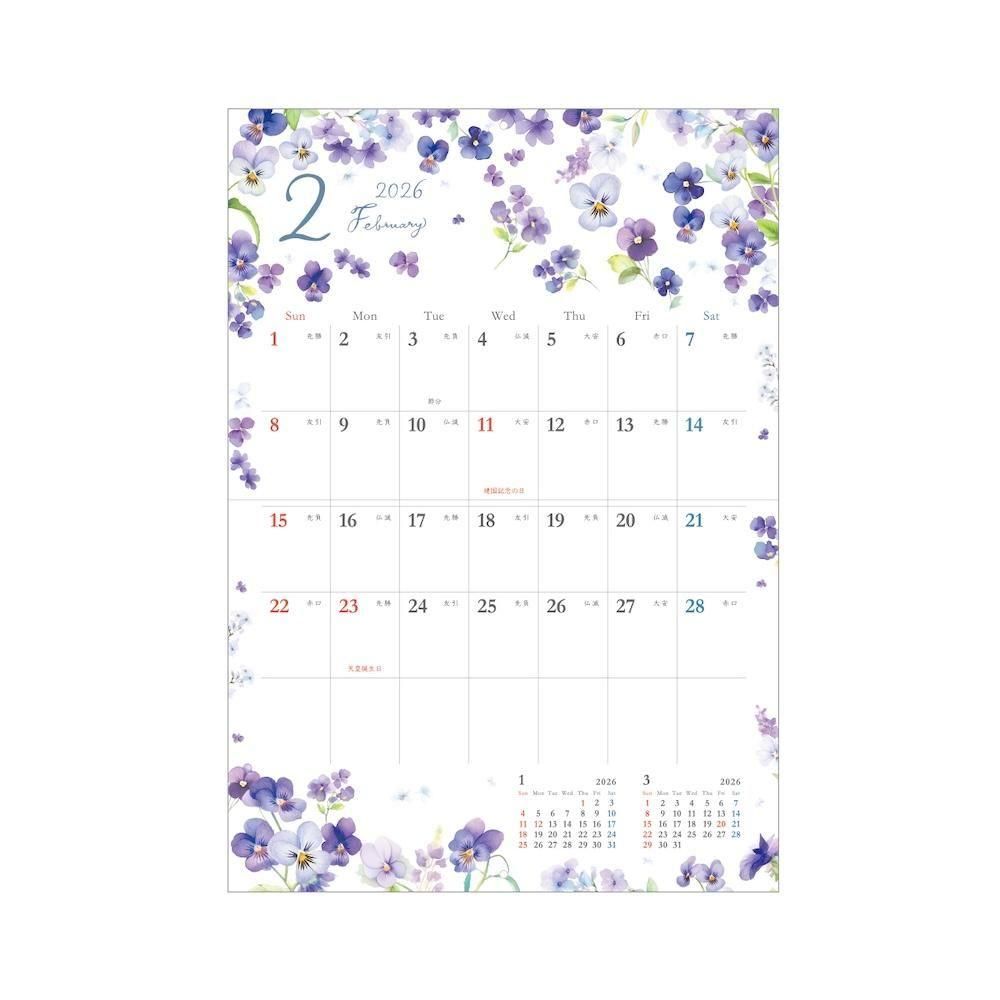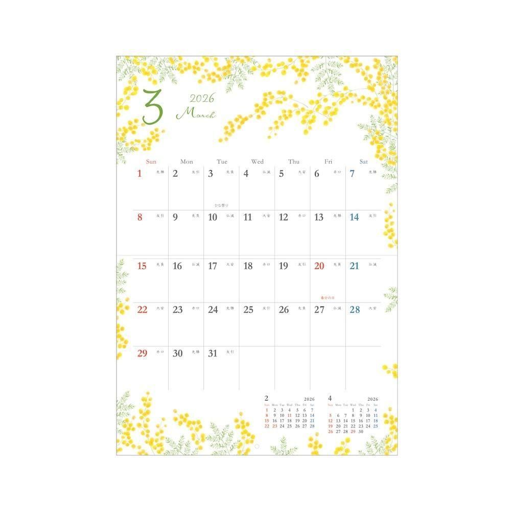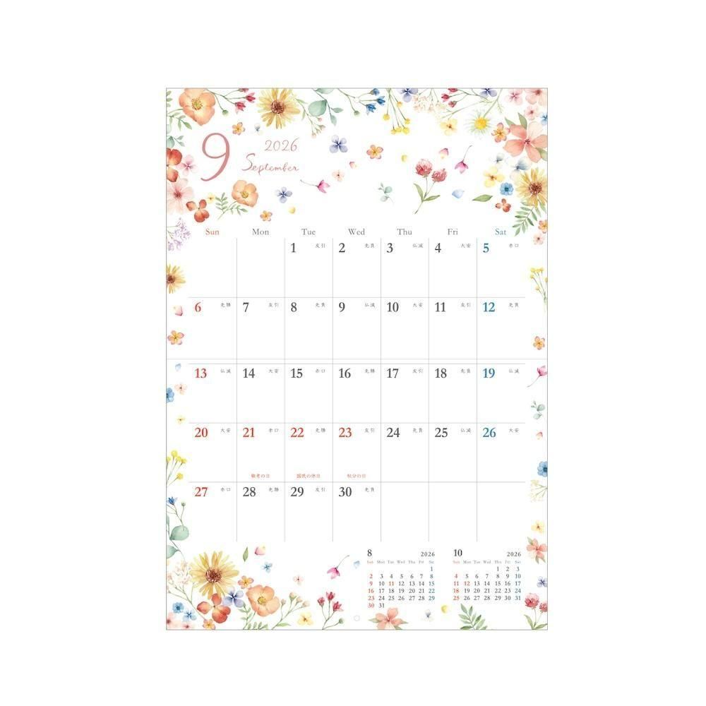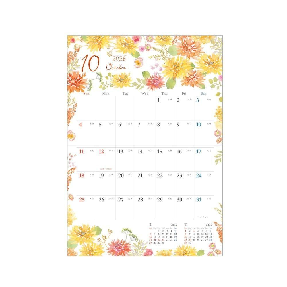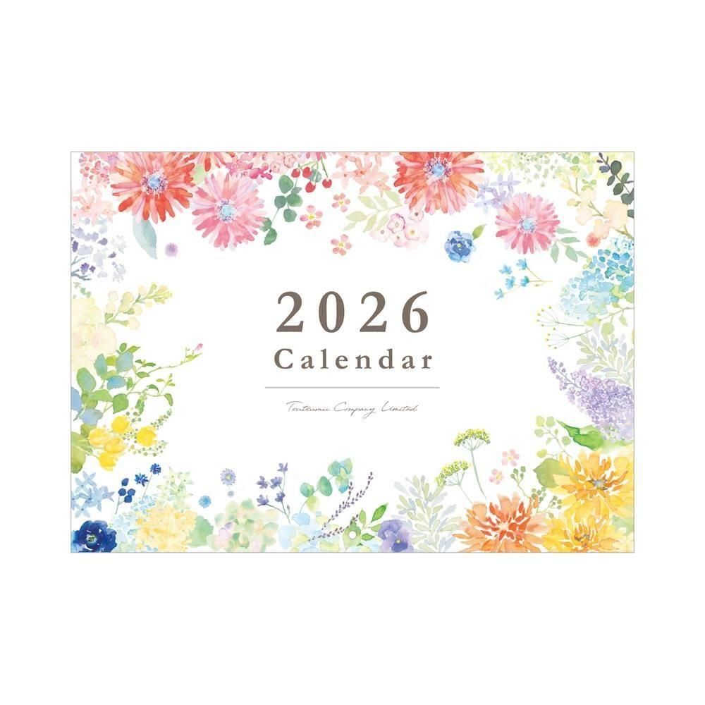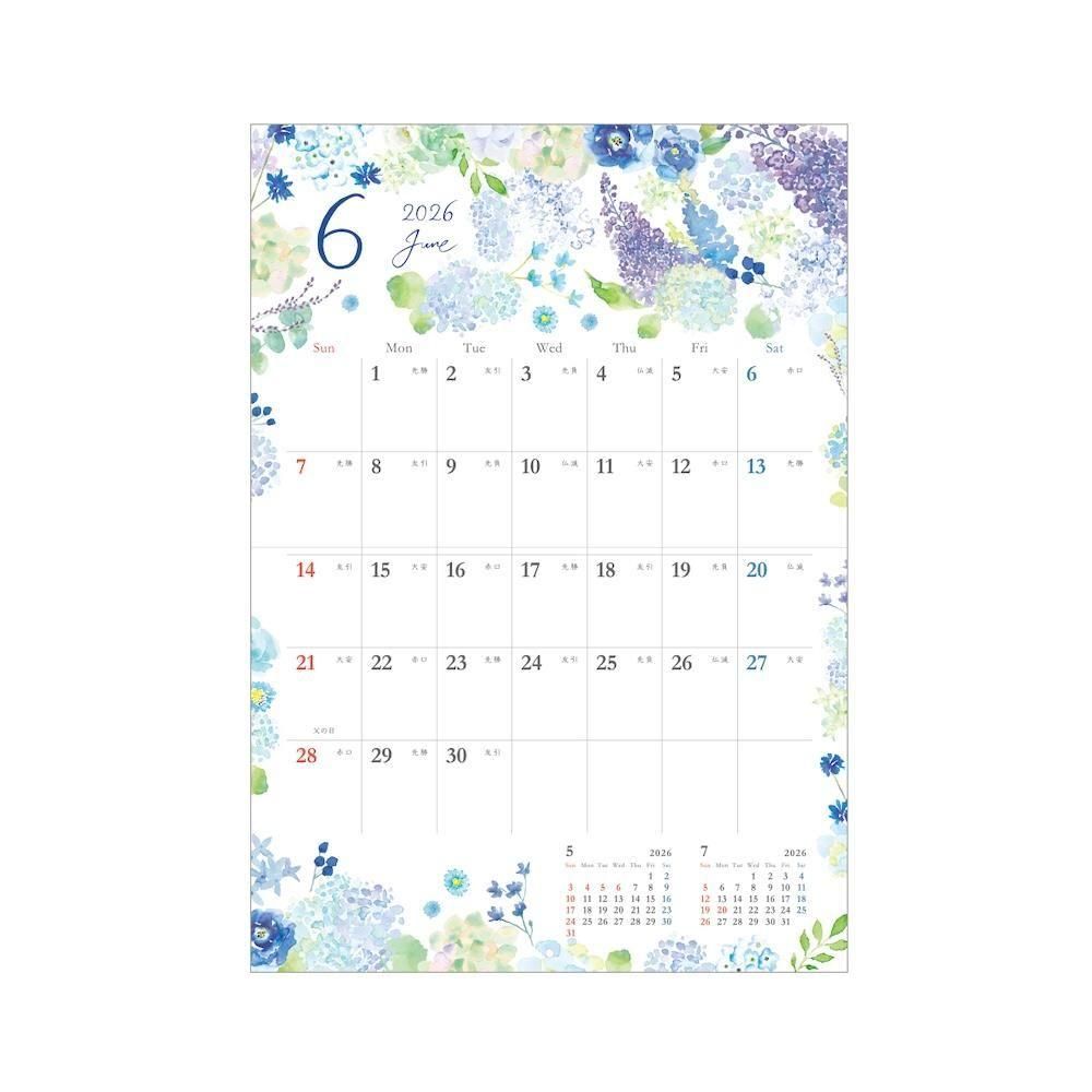 季節の花々が優しい水彩画で描かれた、インテリア性の高い壁掛けカレンダーです。