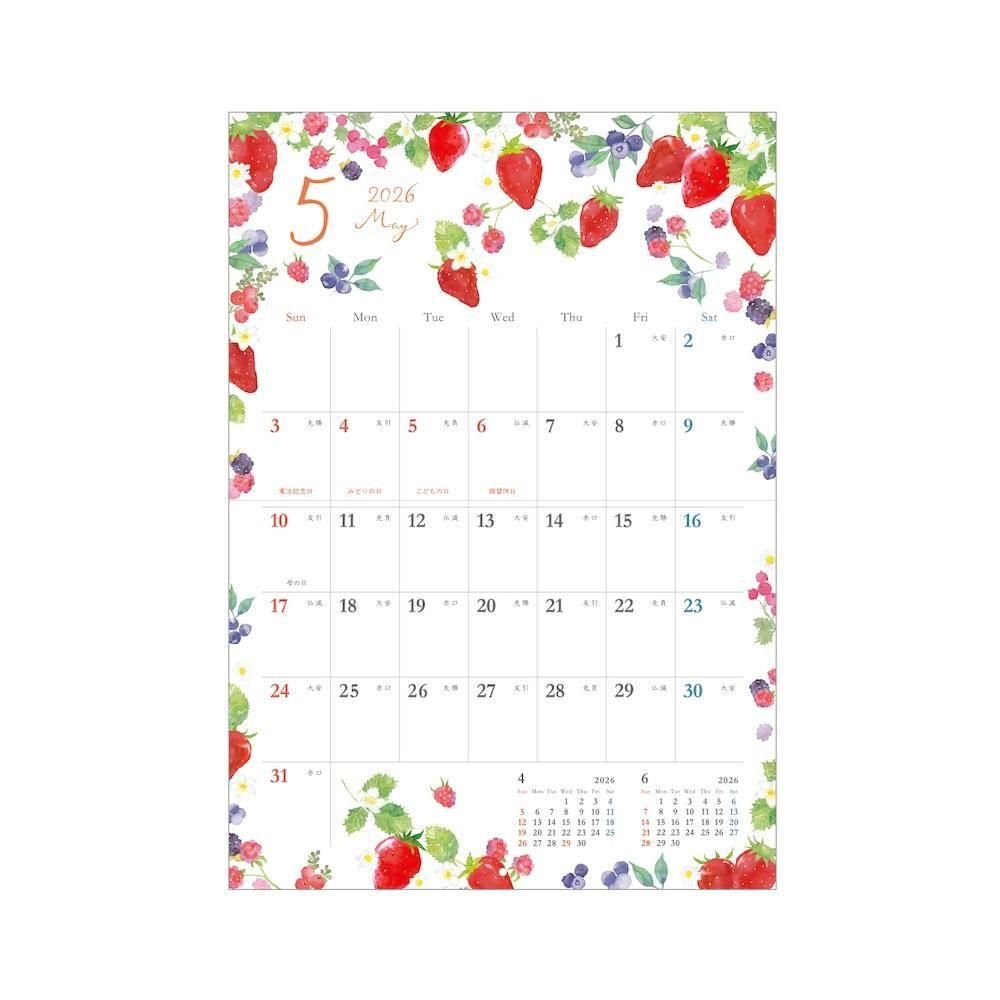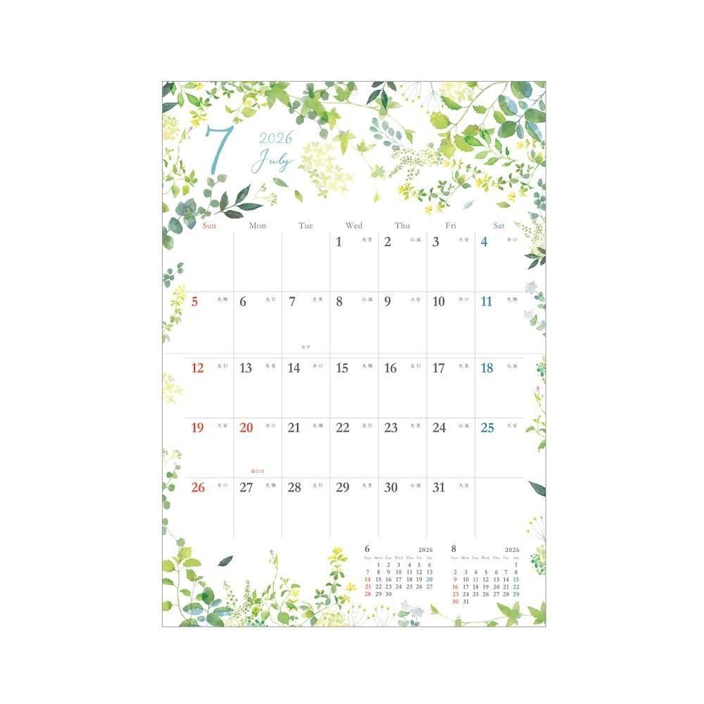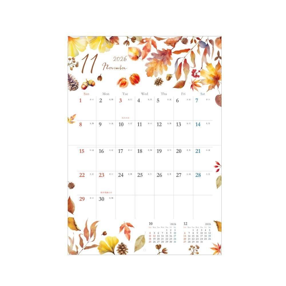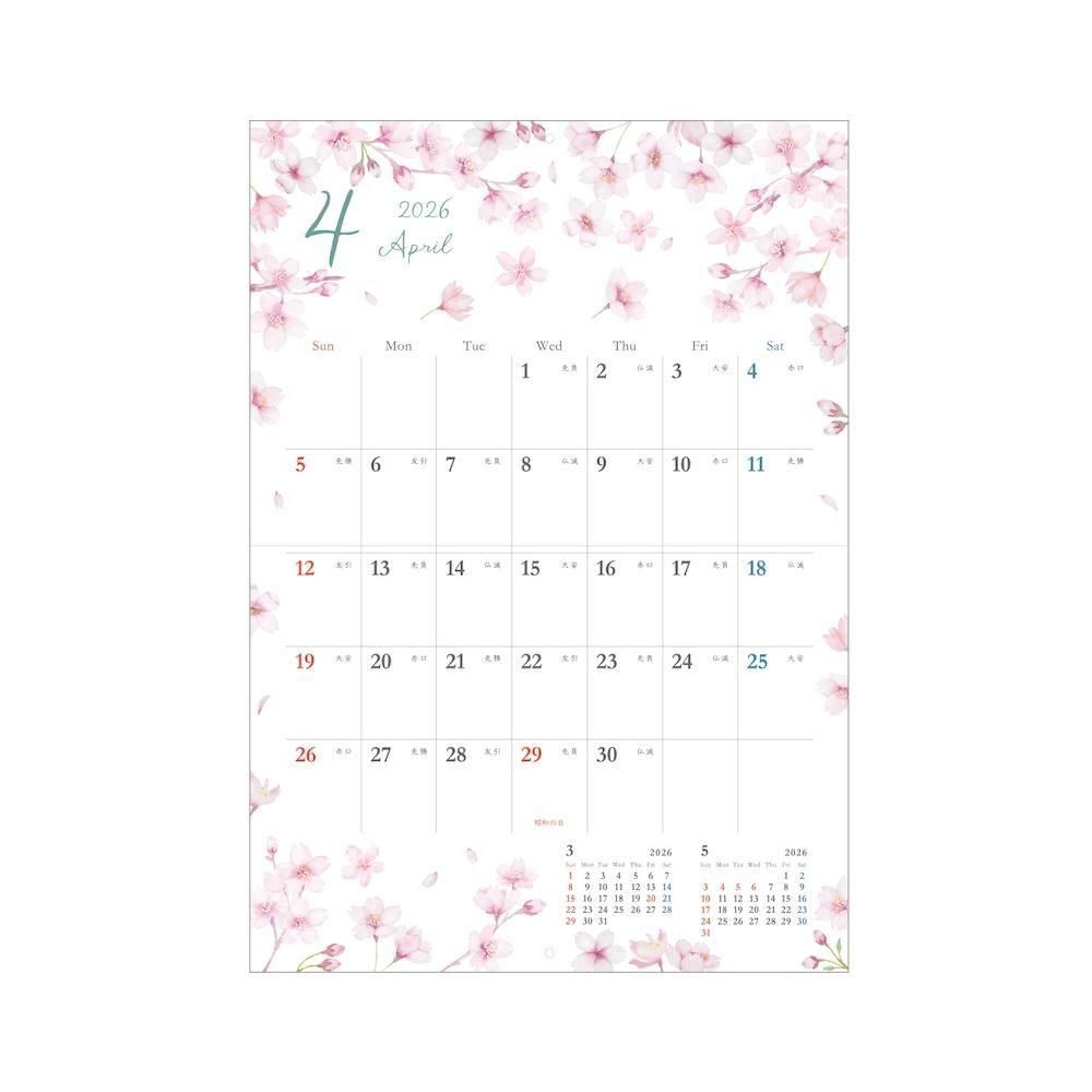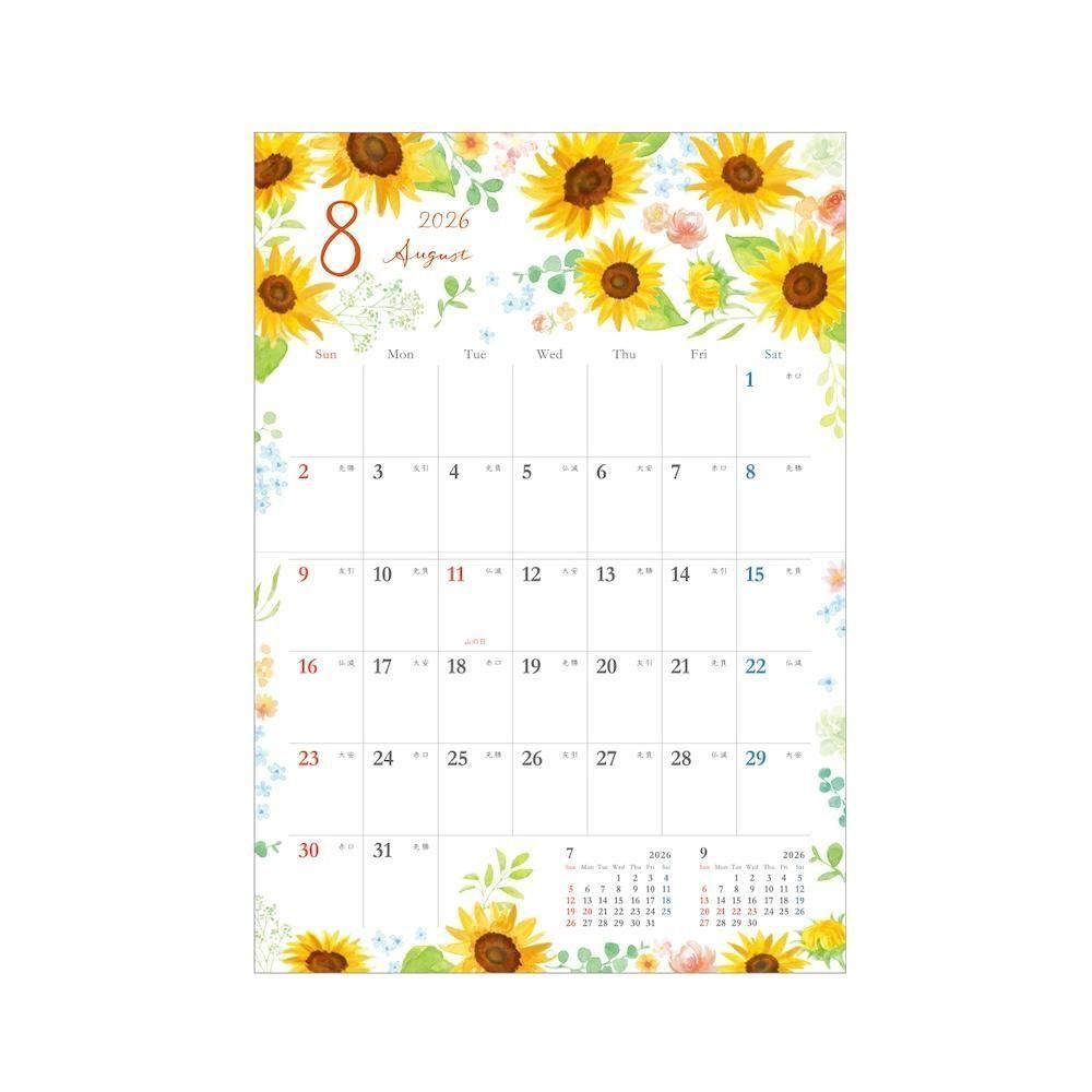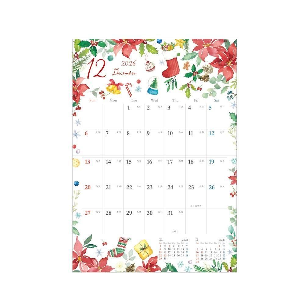 季節の花々が優しい水彩画で描かれた、インテリア性の高い壁掛けカレンダーです。