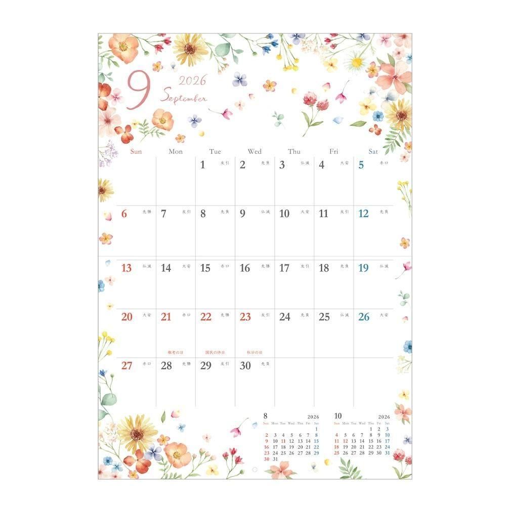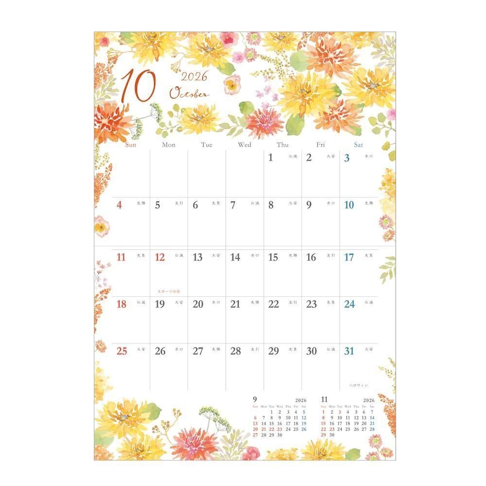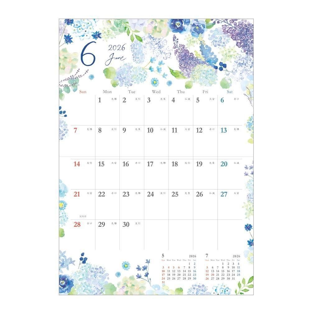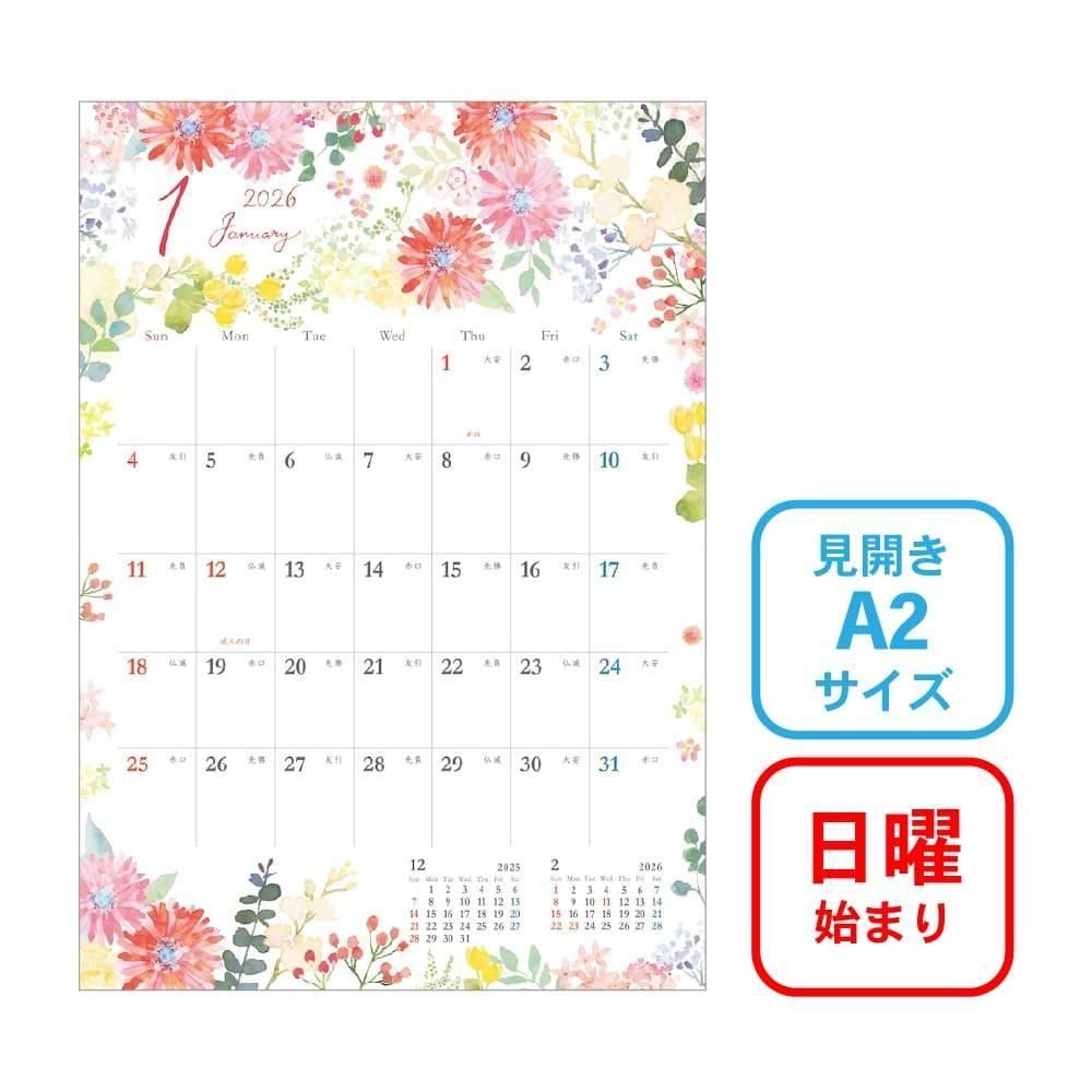 季節の花々が優しい水彩画で描かれた、インテリア性の高い壁掛けカレンダーです。