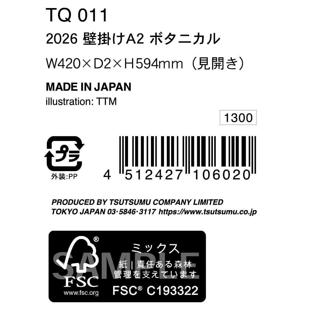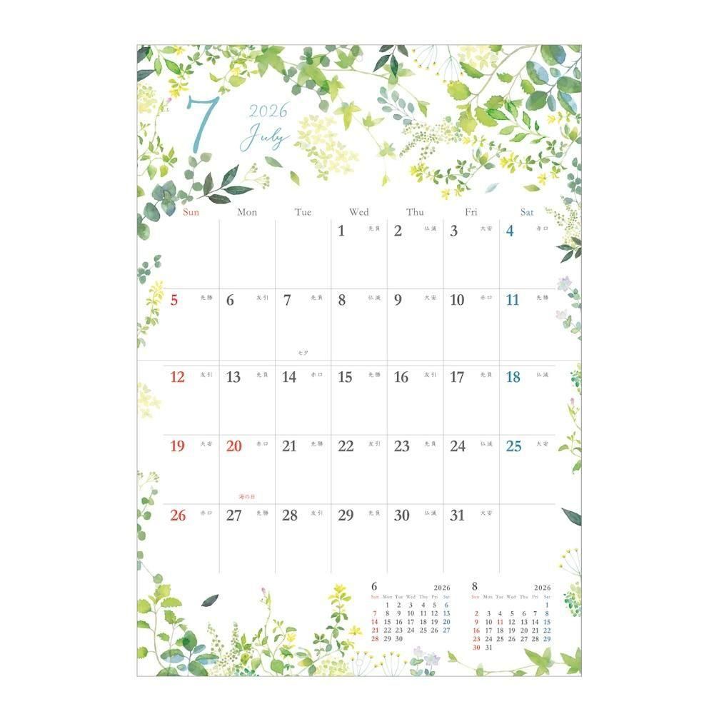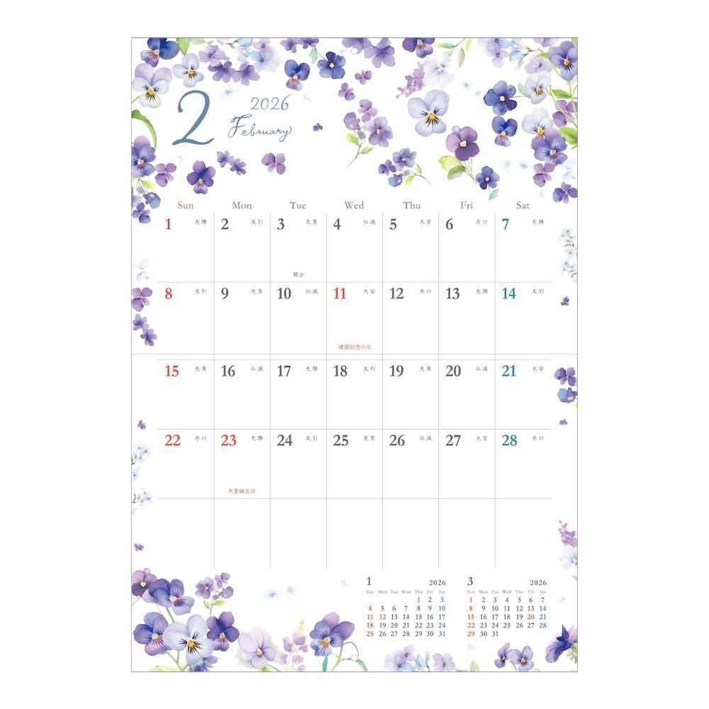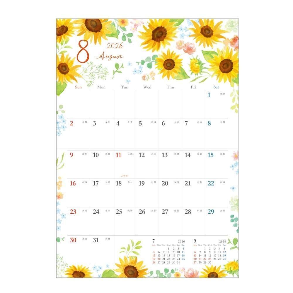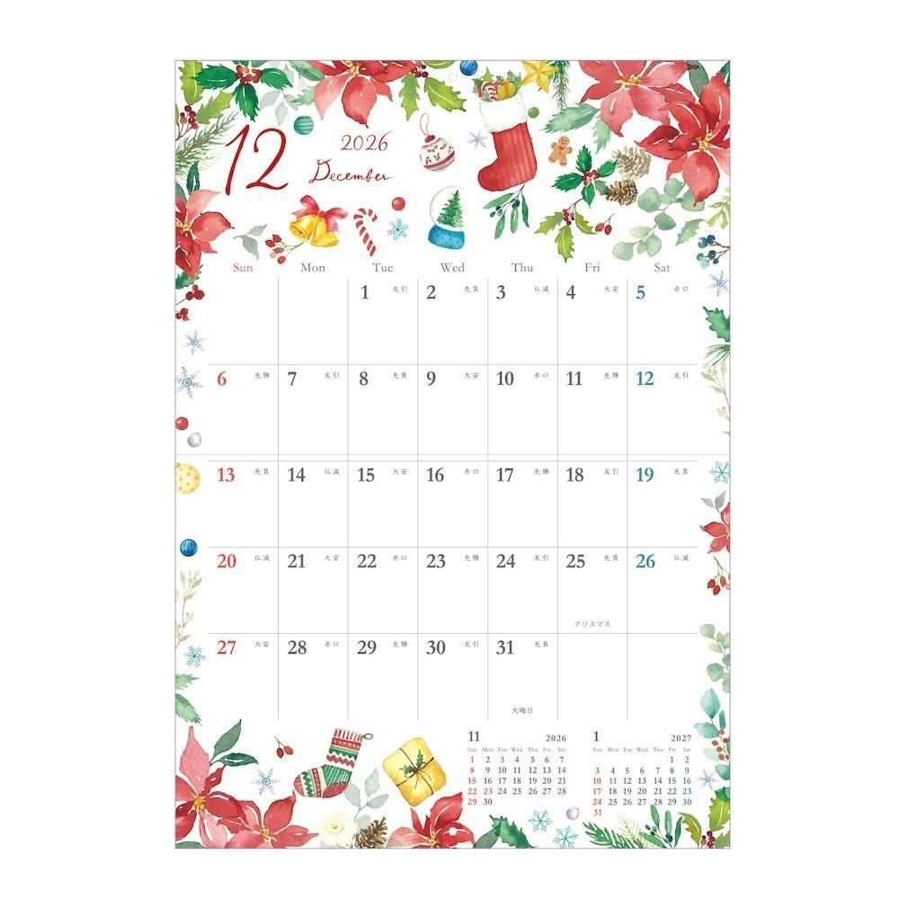 季節の花々が優しい水彩画で描かれた、インテリア性の高い壁掛けカレンダーです。