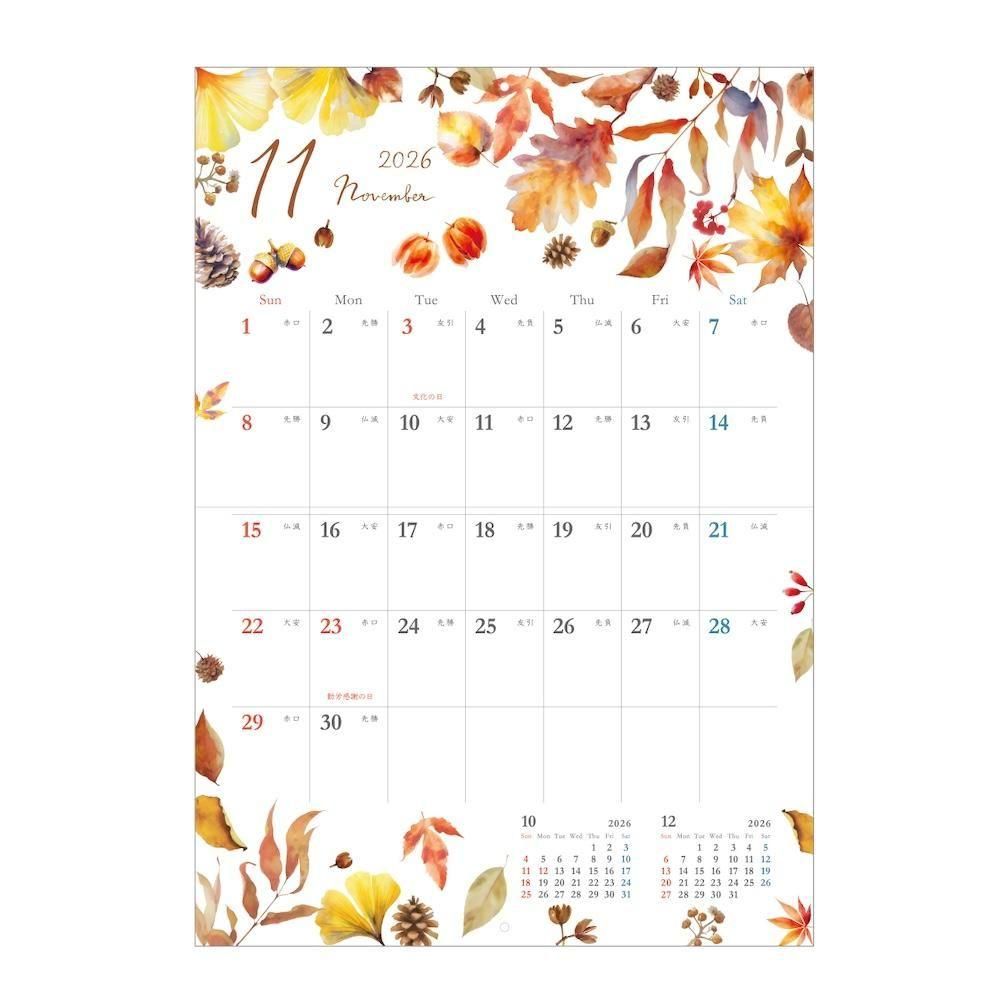 各月には六曜に加え、前月・翌月のカレンダーを右下に掲載。