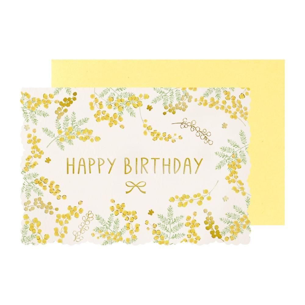 「HAPPY BIRTHDAY」の文字とミモザの一部には金箔押しが施され、やさしい雰囲気の中にも華やかさが感じられるデザインです。