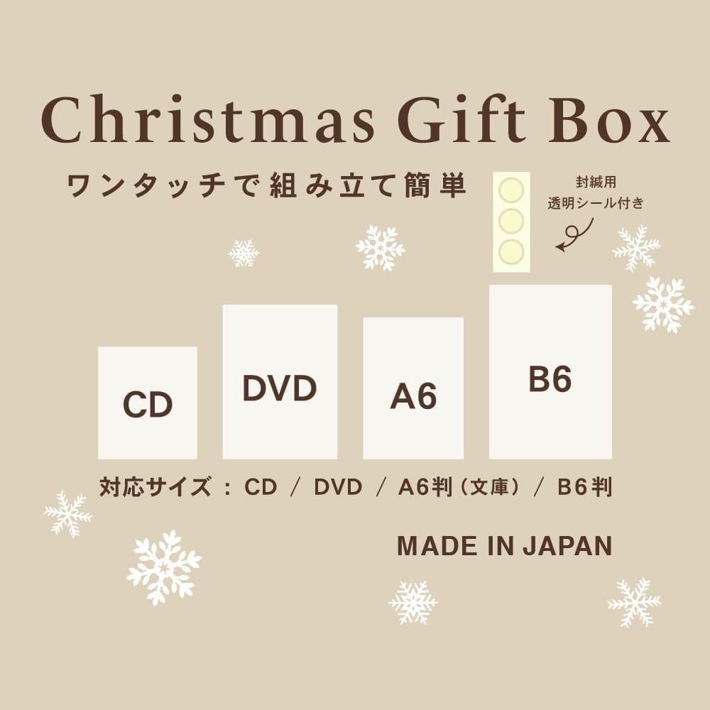 赤色に白い雪の結晶の包装紙風デザインに、緑リボンのイラストが映えるプレゼントボックスデザインになっています。