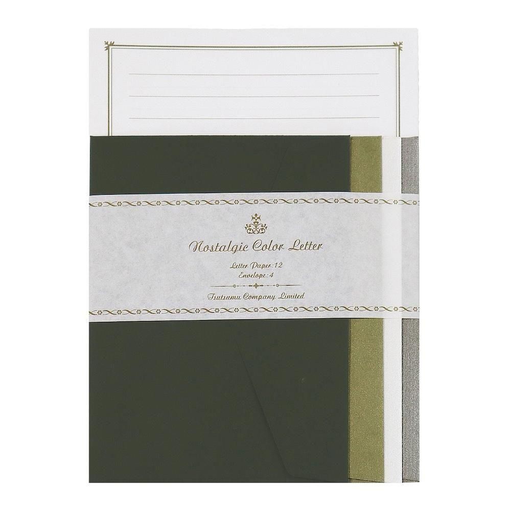 深い緑や、緑みがかったゴールドなど、4種類の封筒がセットになったシンプルなレターセットです。