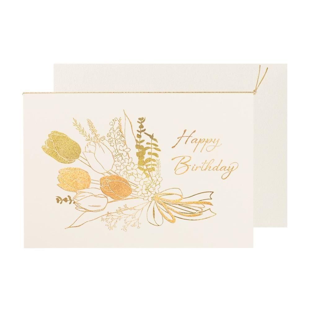 2色の箔押しで描かれた繊細なイラストが美しい、お誕生日祝いの二つ折りメッセージカードです。