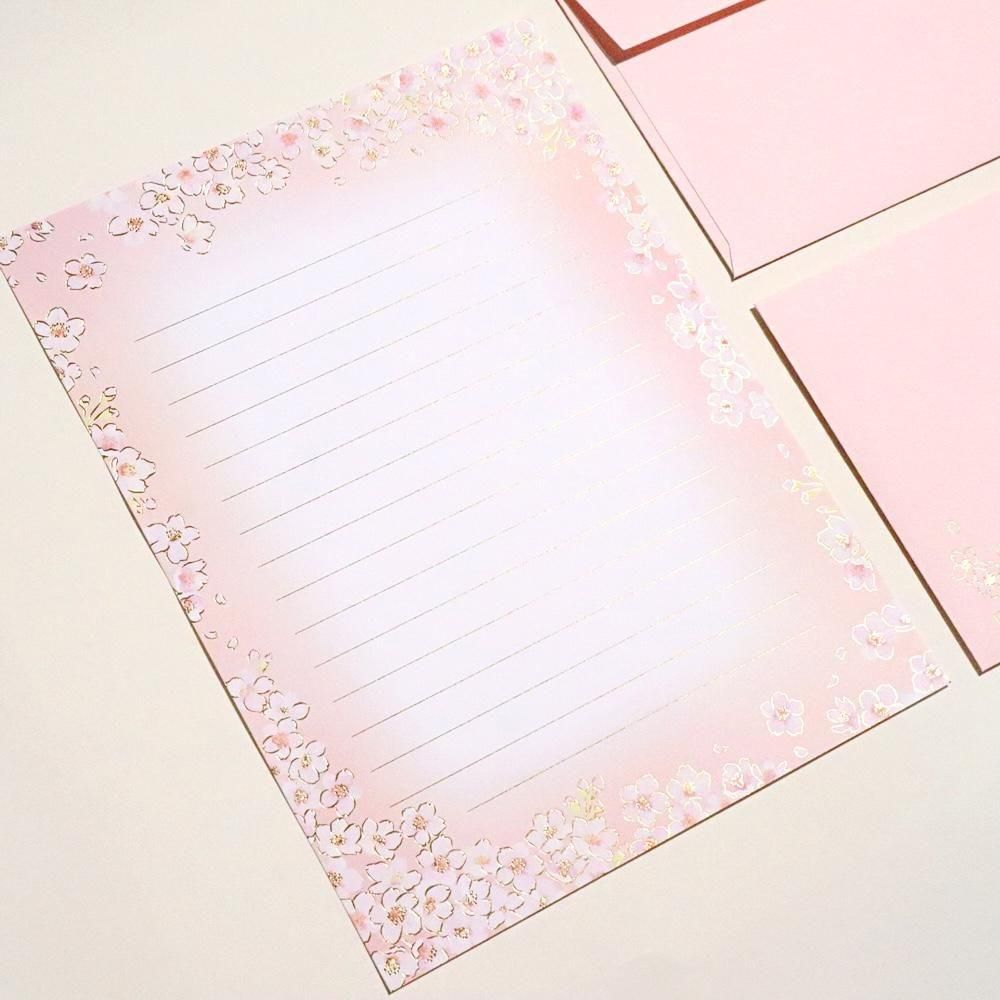 春爛漫に咲き誇る桜が描かれた便箋と、ぴったりなピンクの封筒がセットになったレターセットです。