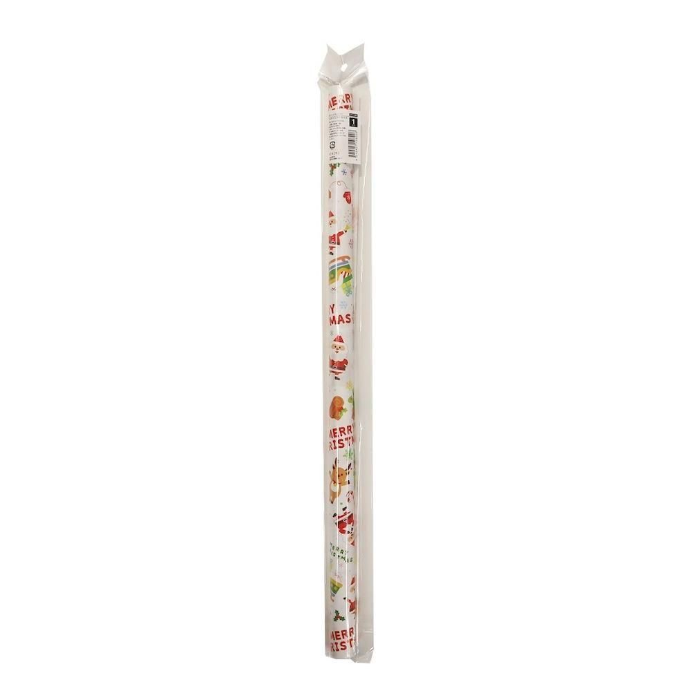 サンタクロース、トナカイ、プレゼント、クリスマスツリーなど、定番モチーフがポップに描かれています。上下を気にせず包めるデザインです。