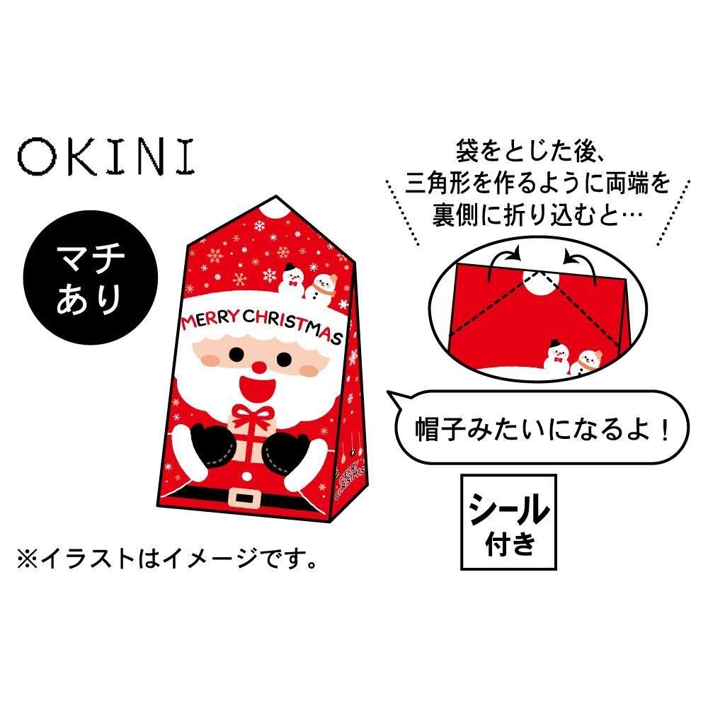 袋の口を三角に折って留めると、白いポンポン飾りのついたサンタクロースの赤い帽子になります。