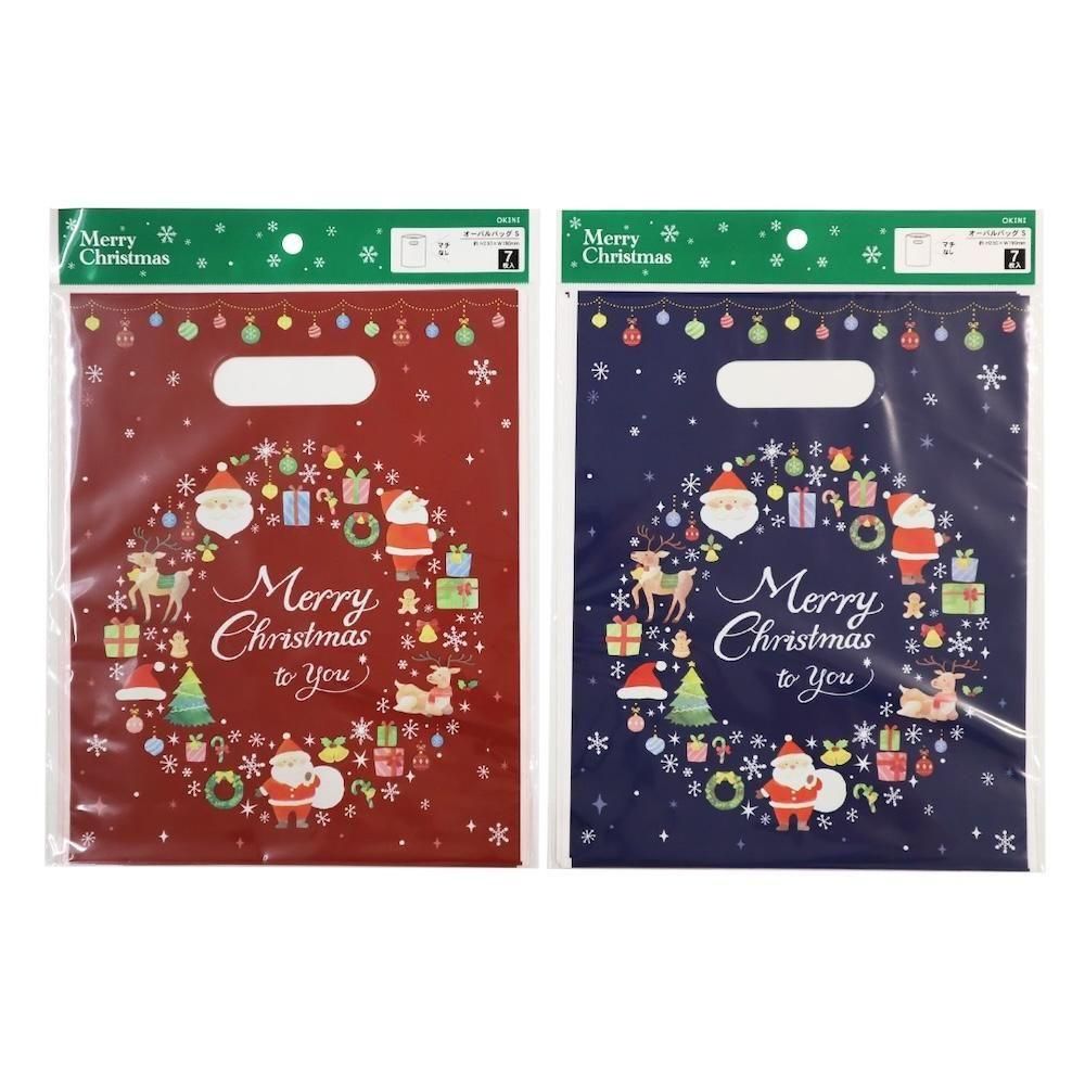 【クリスマス】OKINI 100均 ビニールバッグ 70枚入 持ち手付 サンタリース オーバルバッグ Sサイズ ワインレッド ネイビー