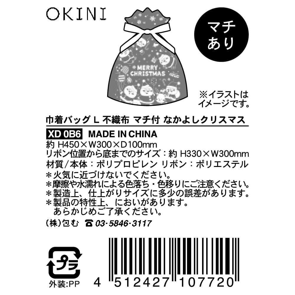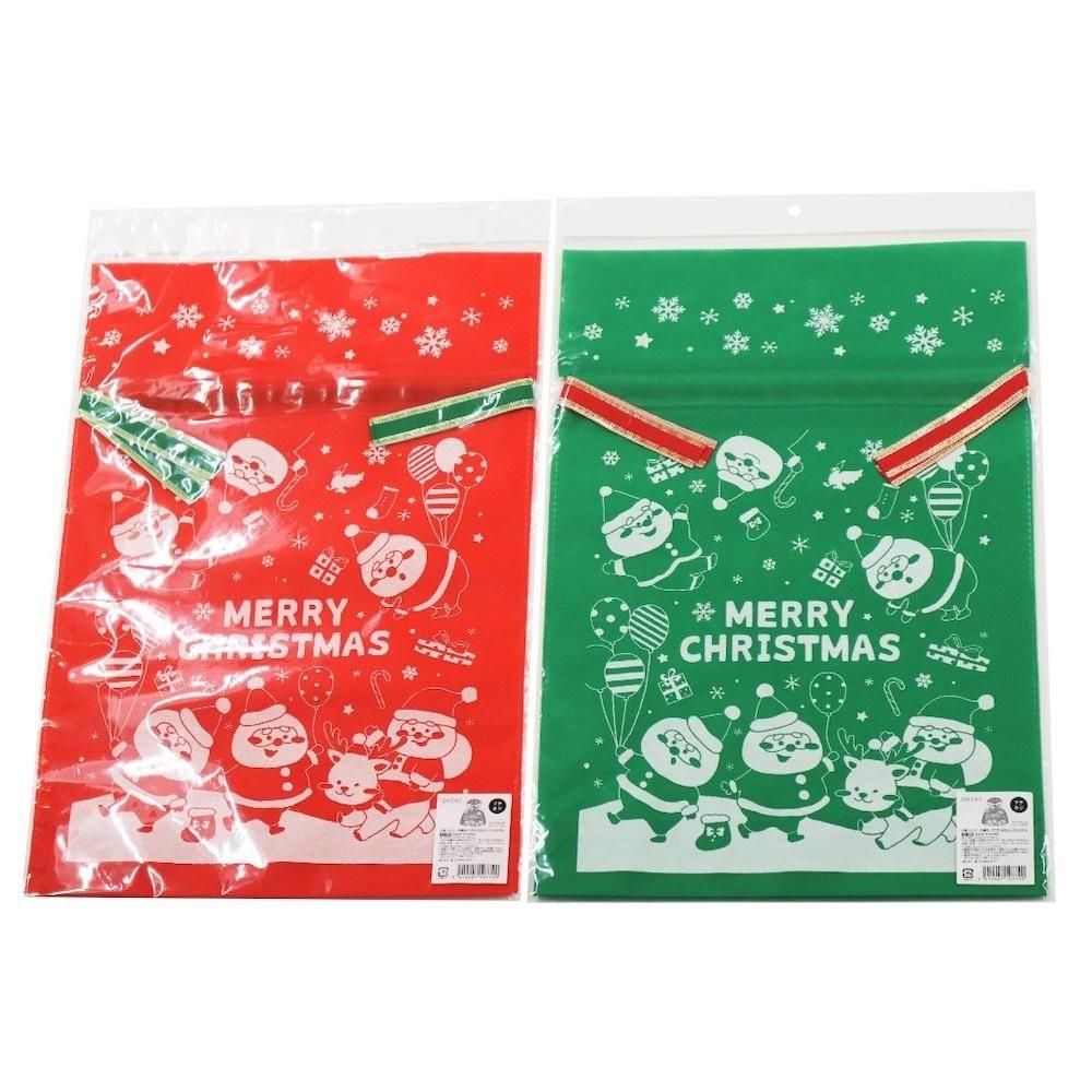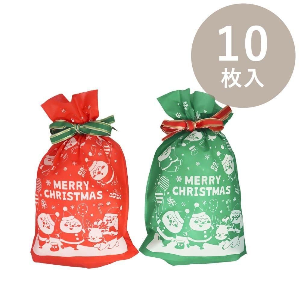 【クリスマス】OKINI 100均 巾着バッグ ラッピング袋 10枚入 不織布 マチ付 なかよしクリスマス Lサイズ 赤 緑