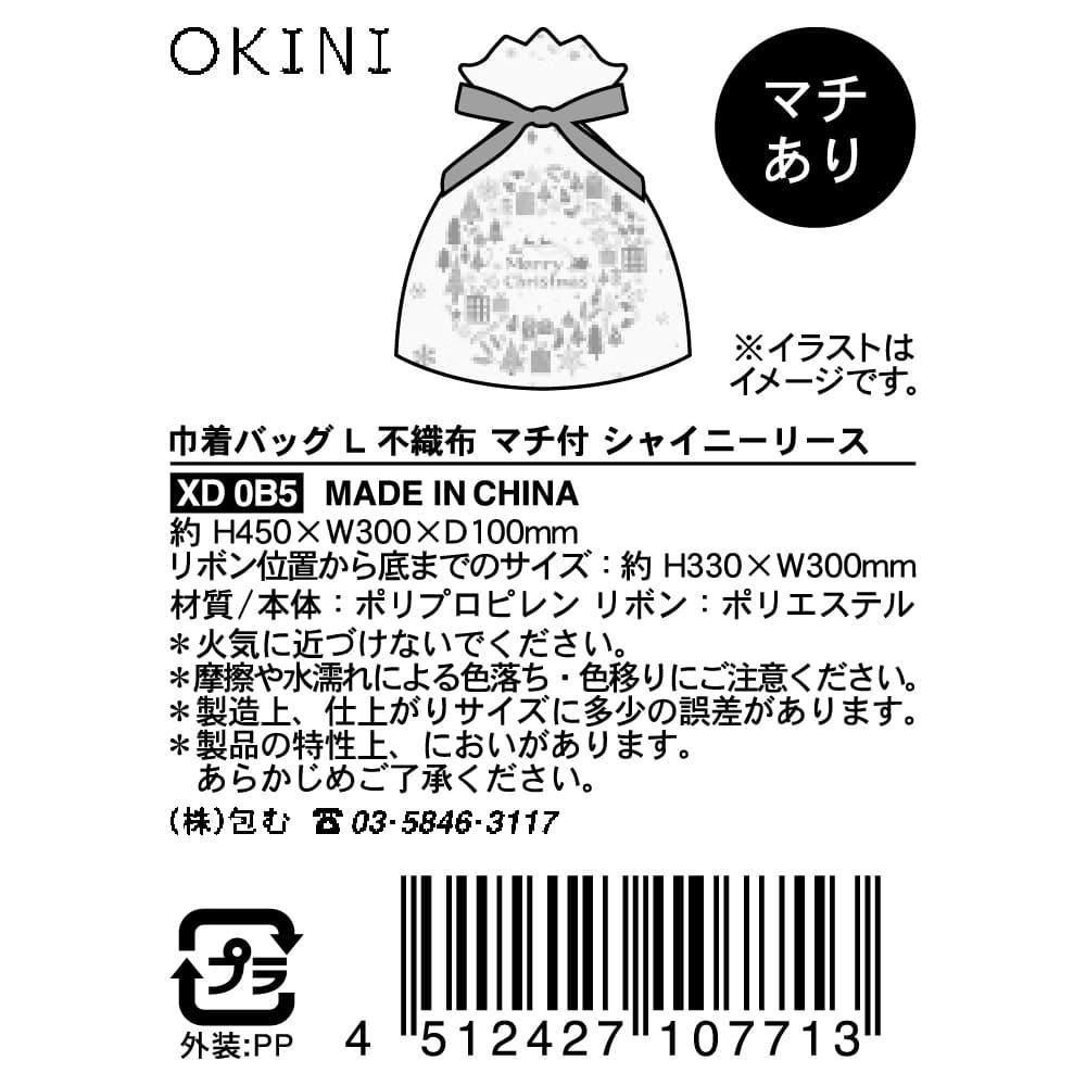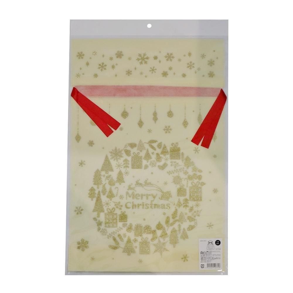 【クリスマス】OKINI 100均 巾着バッグ ラッピング袋 10枚入 不織布 マチ付 シャイニーリース Lサイズ 白