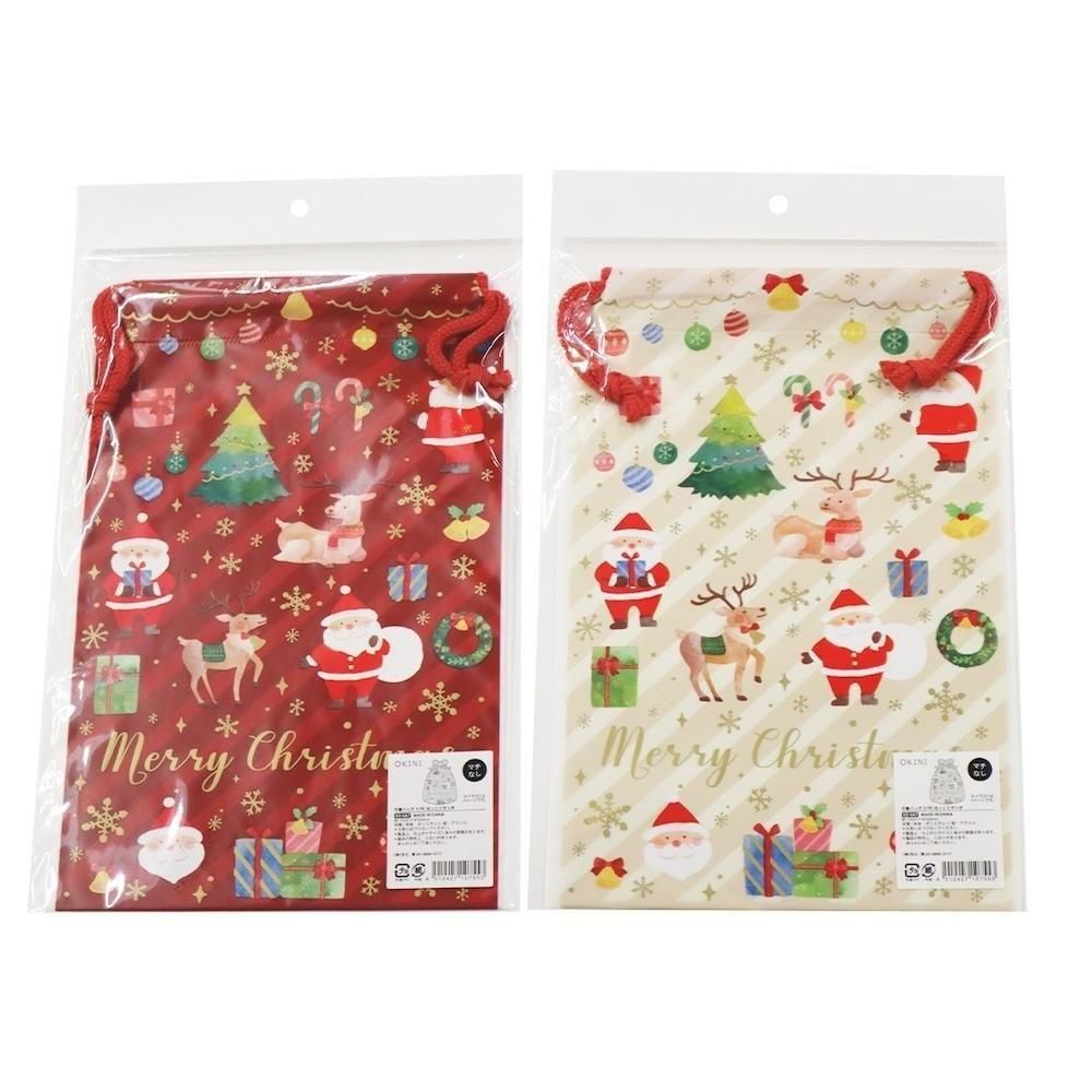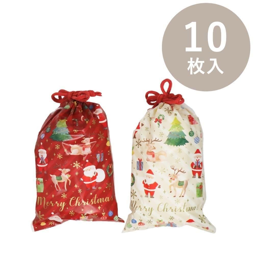 【クリスマス】OKINI 100均 巾着バッグ ラッピング袋 10枚入 ビニール ほっこりサンタ Sサイズ ツリー トナカイ 赤 ベージュ