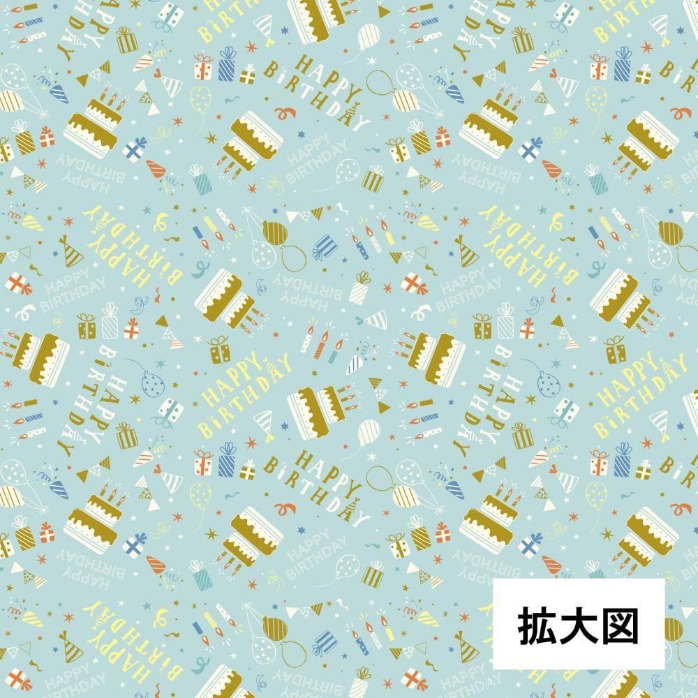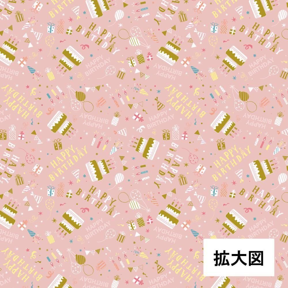 HAPPY BIRTHDAYの文字やケーキのイラストが全面に描かれており、お祝いらしいにぎやかなデザインです。